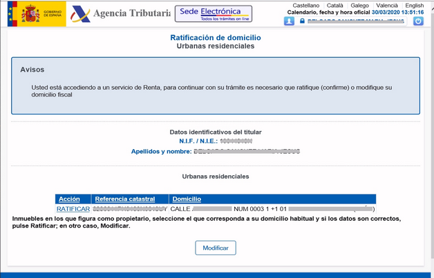 En el proceso de ratificación del domicilio la Agencia Tributaria informa del Domicilio y Referencia Catastral que le constan para que el contribuyente confirme si ese domicilio es el correcto o realice su actualización si detecta algún error o se ha producido algún cambio de domicilio con respecto a la dirección que le consta a la Agencia Tributaria.
