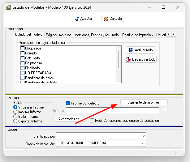 En la ventana que se muestra al llegar a ese punto se podría hacer click sobre el botón «Asistente de informes«…