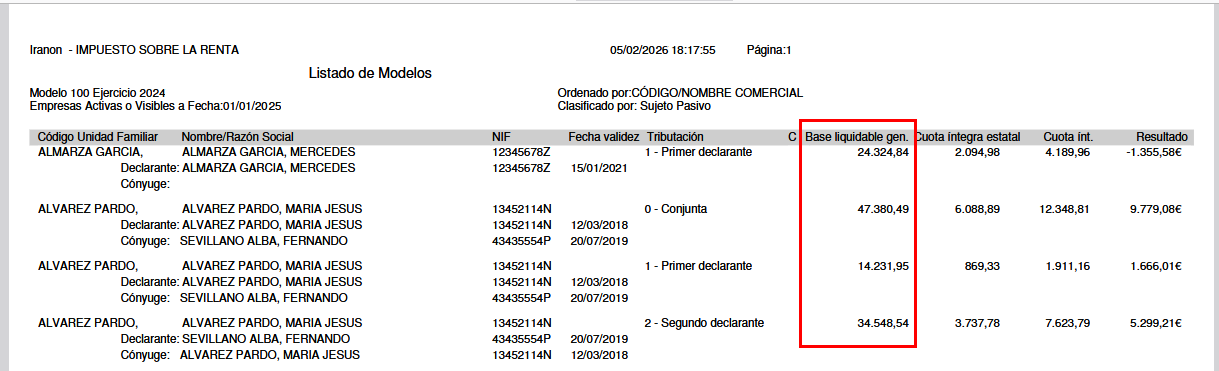 En el asistente de informes el programa incluye varios tipos de listados que incluyen la «Base liquidable general sometida a gravamen» o casilla 505 de la Renta. Algunos de estos informes, además de imprimir el importe de la casilla 505 incluyen otros datos como la «Fecha de validez del DNI».