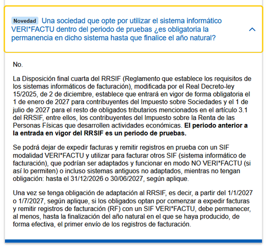 No obstante, después de la última ampliación del plazo de exigibilidad de adaptación que hacía el Real Decreto-ley 15/2025, de 2 de diciembre (BOE 03/12/2025), la Agencia Tributaria ha publicado en su página web de "Preguntas frecuentes (FAQ)" relativas al Reglamento de los SIF y a VeriFactu, indicaciones de que el periodo anterior a la entrada en vigor del Reglamento de los SIF es un periodo de pruebas y que se podrá dejar de expedir facturas y remitir registros en prueba con un SIF modalidad VERI*FACTU y utilizar para facturar otros SIF (sistema informático de facturación), que podrían ser adaptados y funcionar en modo NO VERI*FACTU (si así lo permiten) o incluso sistemas antiguos no adaptados, mientras no tengan obligación: hasta el 31/12/2026 si el emisor es una entidad contribuyente por el Impuesto sobre Sociedaes o hasta el 30/06/2027 en el resto de contribuyentes,