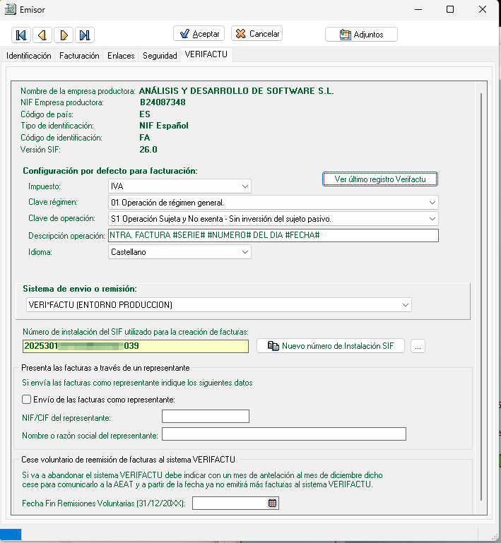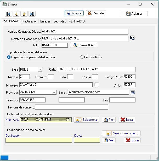 En la solapa "VERIFACTU" de la ficha de datos de cada Emisor se solicitan los principales datos necesarios para expedir facturas en formato VeriFactu.