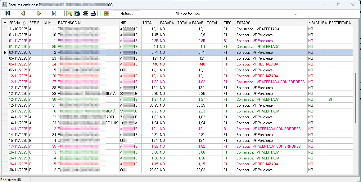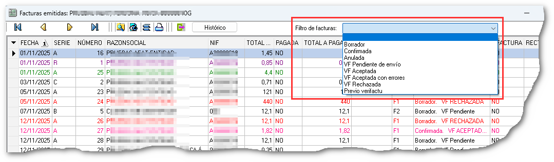 En el browser o ventana de selección de facturas se muestran las facturas en diferentes colores para indicar el estado o situación en la que está cada factura. Será importante fijarsse en la columna ESTADO para saber las facturas que se están realizando y están todavía en estado "Borrador" o las que ya se han confirmado o expedido y están ya transmitidas a VERIFACTU o las que están todavía en la cola de envío, etc.