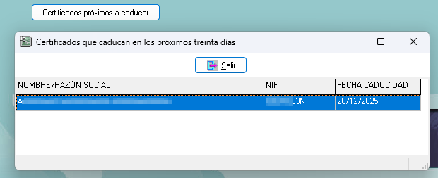 Al pulsar este botón se abre una ventana en la que se puede ver la lista de Certificados que puedan tener una fecha de expiración cercana.