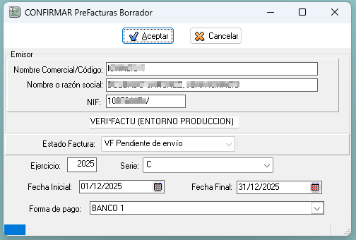 La opción "Confirmar PreFacturas Borrador" permite seleccionar el tipo de facturas que se quieren confirmar o expedir y remitir sus datos a VERIFACTU. Las facturas se pueden seleccionar por ejercicio, serie, fechas y por forma de pago.