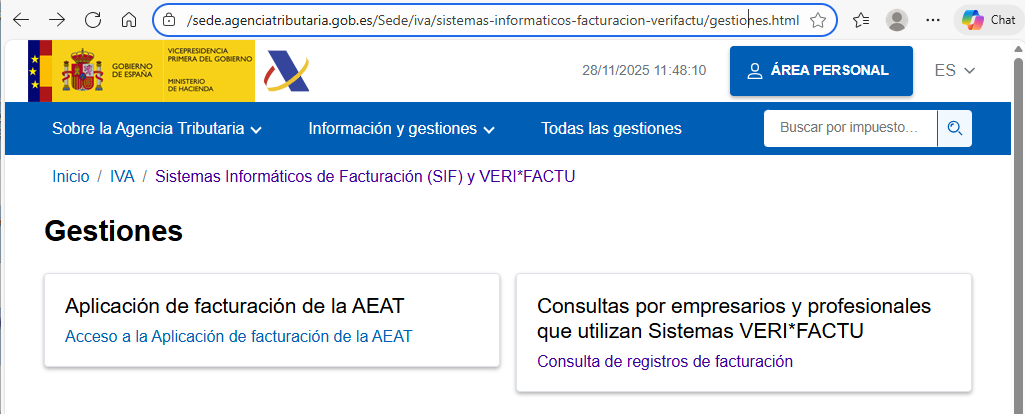 En la Sede electrónica de la Agencia Tributaria en Internet se pueden consultar las facturas que se han registrado en VERIFACTU. Se puede acceder con el siguiente enlace...