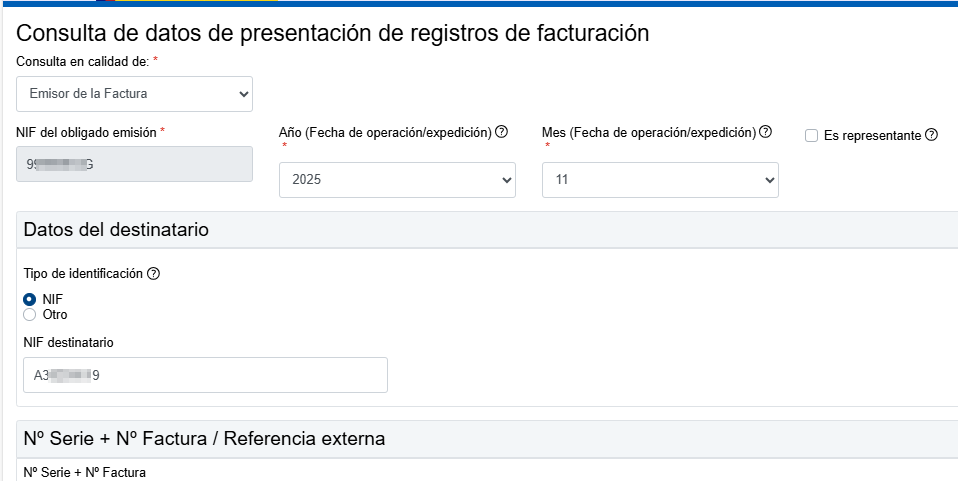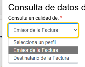 Al principio de la página se puede seleccionar si la consulta de facturas se realiza como Emisor de la Factura o como Destinatario o cliente...