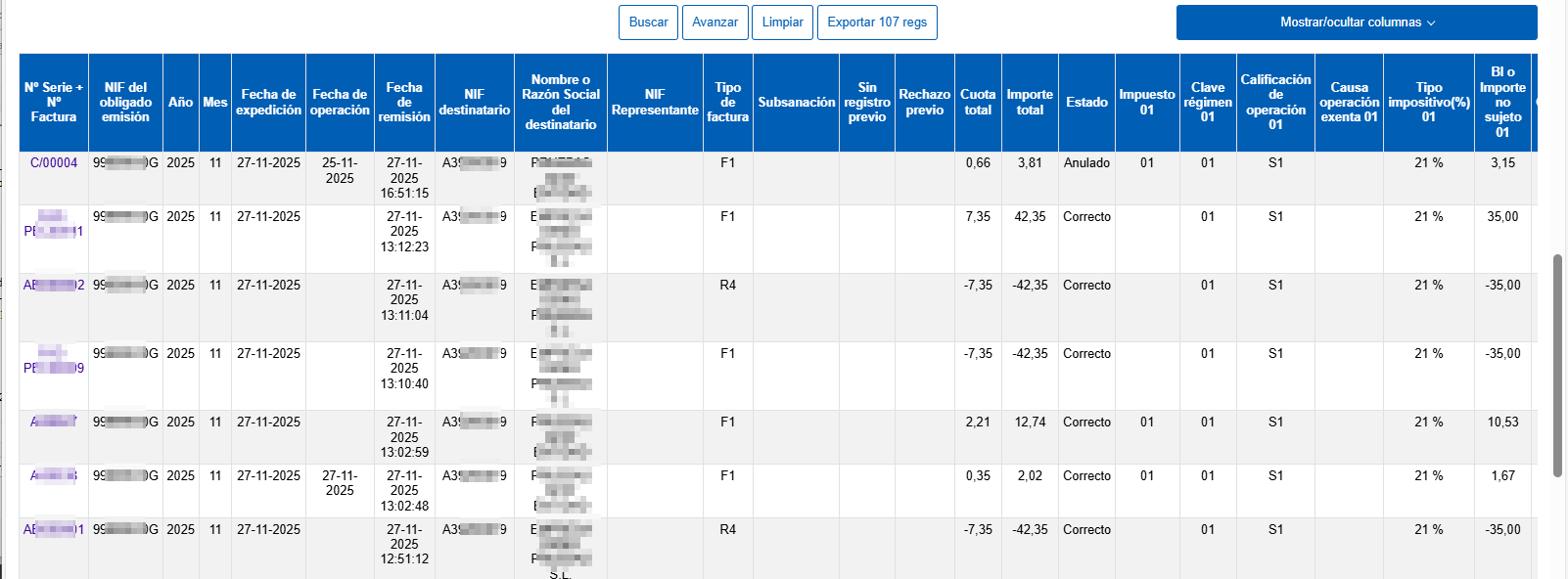 Se mostrarán los datos de las facturas que respondan a los criterios de búsqueda indicados como puede ser la fecha de expedición de la factura, la Serie y Número de la factura o el NIF del emisor o del cliente, etc.
