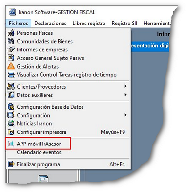 La configuración y uso de la aplicación IrAsesor en los programas Iranon de tipo fiscal se realiza desde la opción "Ficheros", "APP móvil IrAsesor".