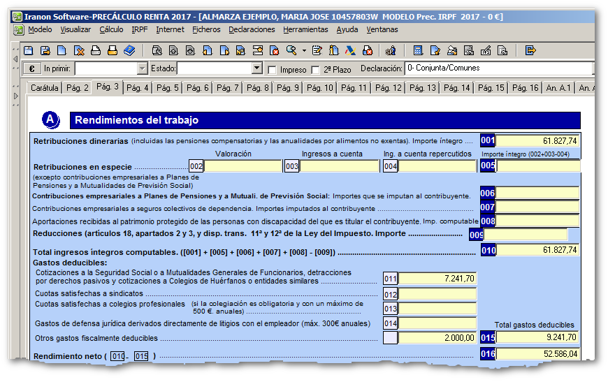 Una vez que se ha grabado la ficha de datos personales del contribuyente ya se podrían realizar sus declaraciones. La declaración se puede abrir accediendo al menú "Declaraciones", "Declaraciones anuales", "Precálculo del I.R.P.F.".