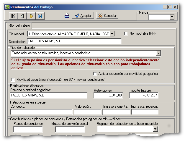 La información económica de toda la unidad familiar se puede introducir normalmente desde cualquiera de los tipos de tributación (conjunta/individuales) porque en cada ficha de datos será necesario indicar el contribuyente al que corresponde la información o su porcentaje de participación.