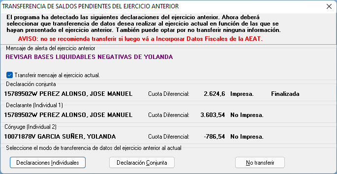 Por ejemplo, si por error se le indica al programa que traslade los datos desde la declaración conjunta del año anterior y realmente esa unidad familiar presentó declaraciones individuales, es muy probable que los saldos y datos pendientes que se trasladen del año anterior sean incorrectos (excesos aportaciones a planes de pensiones de años anteriores, saldos de deducciones pendientes de aplicar, bases liquidables negativas, etc.). Lo mismo ocurriría en el caso contrario, es decir, si en el ejercicio anterior se presentó declaración conjunta y por error se solicita el traslado de datos pendientes desde las declaraciones individuales.