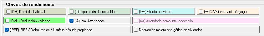 Al principio de la ficha de datos de cada inmueble existe un bloque de casillas con el título “Claves de rendimiento” en la que se pueden marcar los tipos de rendimientos o apartados de las declaraciones de Renta y Patrimonio a los que se van a trasladar los datos del inmueble.