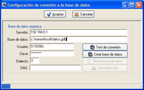 En esta casilla es necesario especificar la ruta completa hasta el fichero de base de datos. Por ejemplo, si se introduce la ruta "C:\IRANONFISCAL.GDB" la base de datos se creará en el disco "C:".