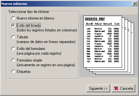 Para crear un nuevo informe elija la opción del menú "Fichero|Nuevo", o pulse el correspondiente botón rápido en la barra de herramientas. Aparecerá el experto para crear informes que puede utilizar para una más fácil y rápida creación de un primer diseño del informe.