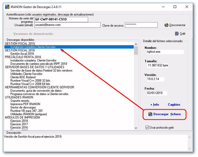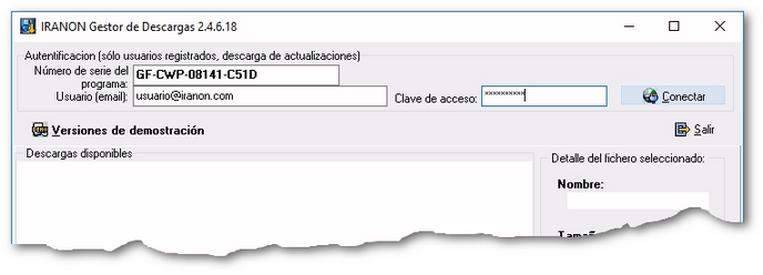 Al adquirir el programa habrá recibido un "Número de serie" de la aplicación que se necesitará para realizar la descarga y luego la instalación del programa. Para descargar la aplicación también será necesario que se haya registrado como usuario en Iranon indicándonos un "Usuario (email)" y una "Clave de acceso" para realizar la descarga.