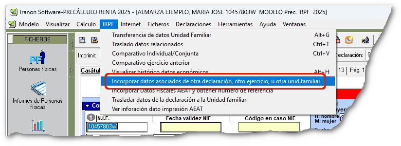 Esta opción se puede realizar desde la declaración de Renta 2025 ejecutando la opción del menú “IRPF”, “Incorporar datos asociados de otra declaración, otro ejercicio u otra unidad familiar”.