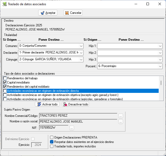 Al ejecutar este proceso el programa solicita que se marquen los apartados de las declaraciones que se desean recuperar y sólo se realizará el traslado de aquellos rendimientos y apartados señalados. En la ventana de traslado existe una casilla: "Respetar datos existentes en el ejercicio destino" para indicarle al programa si ha de conservar los datos existentes en el ejercicio actual al hacer la importación o, por el contrario, inicializar esos apartados antes de realizar el traslado.